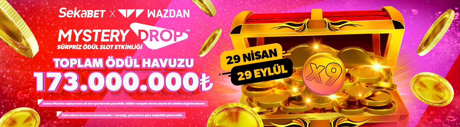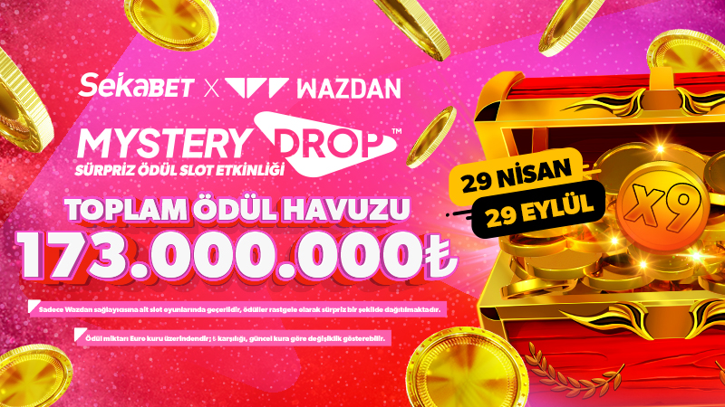 1. Wazdan Mystery Drop Sürpriz Ödül Etkinliği 29 Nisan - 29 Eylül tarihleri arasında Sürpriz Ödül Düşüşü olarak gerçekleştirilecektir. Wazdan sağlayıcısına ait tüm slotlarda geçerlidir.