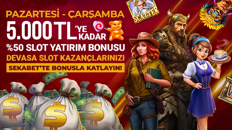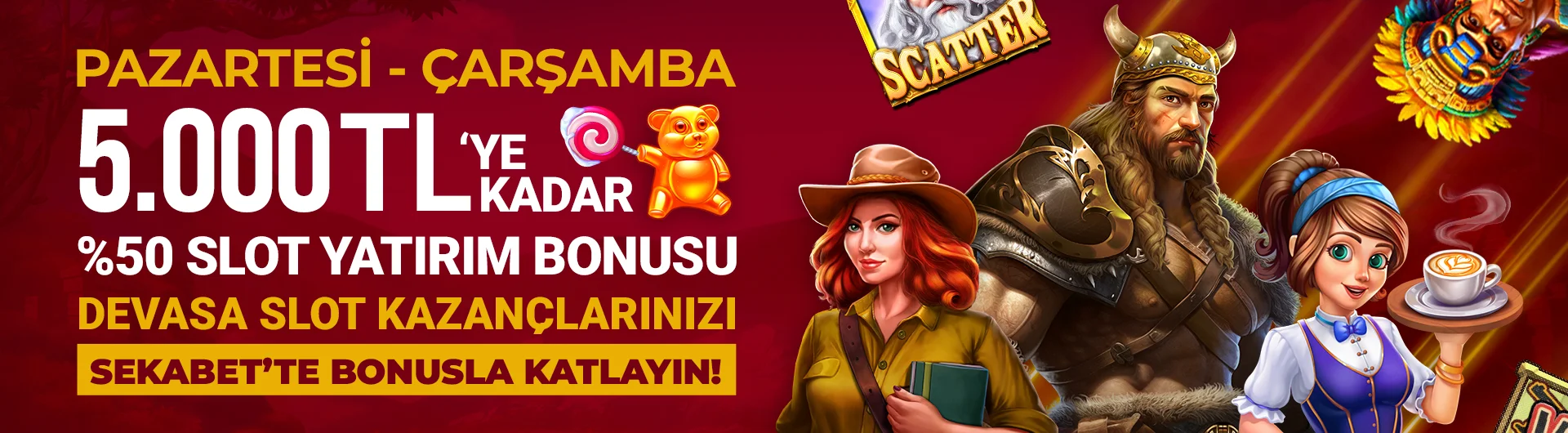 2. Pazartesi ve Çarşamba günlerine Casino Slot oyunları için yapacağınız yatırımlara 5000 TL' ye kadar %50 bonus alabilirsiniz. Talep edilebilecek en az bonus miktarı 10 TL' dir.